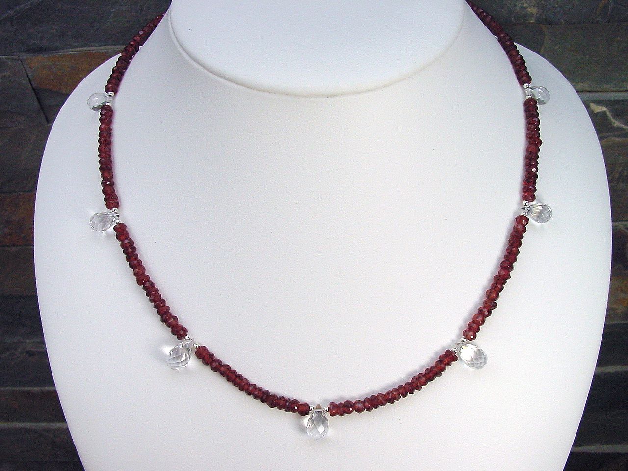 Modernes Collier aus roten facettierten Granat Linsen elegant kombiniert mit klaren Bergkristalltropfen im Brioletteschliff.