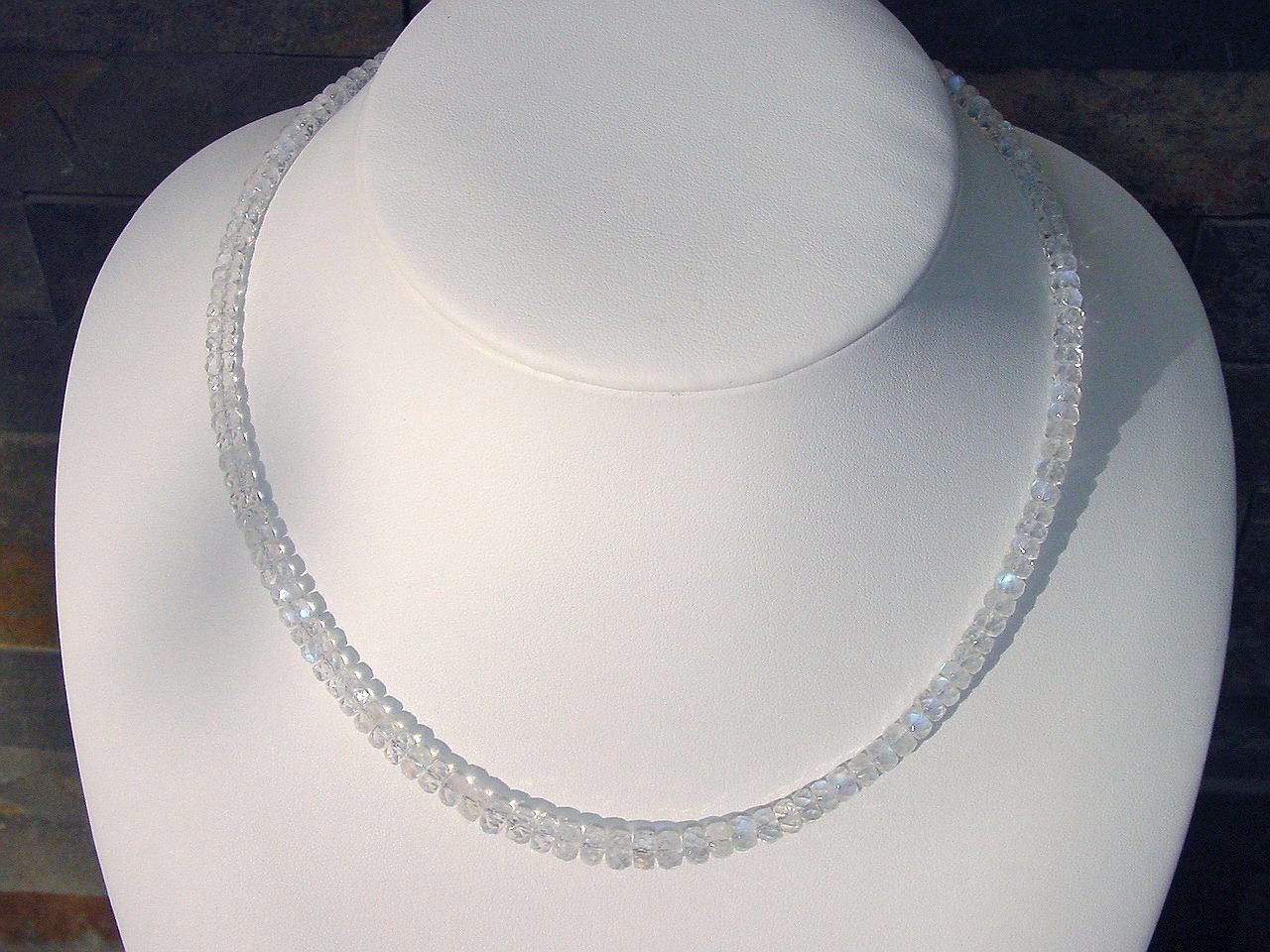 Atemberaubendes Collier aus 88,80 Carat feinstem Regenbogenmondstein mit blauem Schimmer. Die Regenbogenmondsteine sind zu funkelnden Rondellen mit leichtem Größenverlauf von 4 mm an den Enden zu 6 mm im Zentrum der Kette facettiert, beim Bewegen des Schmuckstückes leuchten sie in feinem Blau auf. Hochwertige Qualität, gefördert in Sri Lanka.
