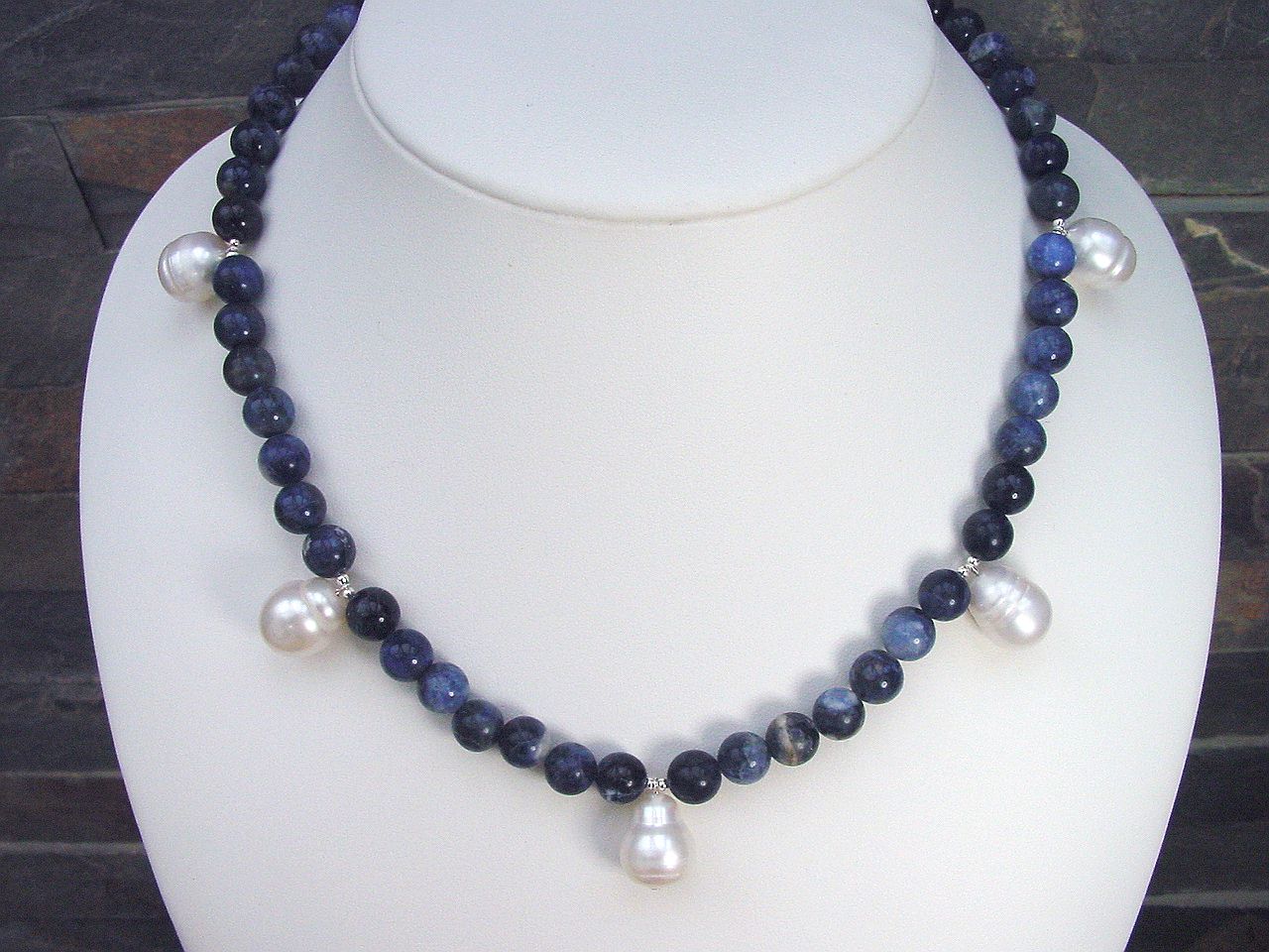 Collier aus blauben Sodalitkugeln, kombiniert mit Tropfen von strahlend weißen Süßwasserzuchtperlen in Barockform.