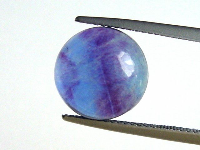 Großer Fluorit im Cabochonschliff mit intensiver Farbe. In natura nicht rein blau wie auf den Bildern ersichtlich, sondern mit phantastischem stark grünstichigem Blauviolett-Ton mit interessanter Farbzonierung. Schöner Schmuck- oder Sammlerstein aus Erongo, Namibia.