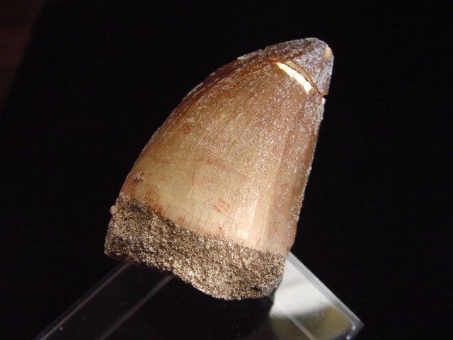 Dieser Mosasauruszahn ist geklebt worden. Er zeigt fein erhaltene Zahnschmelzstrukturen und stammt aus Marokko - es handelt sich um ein Original - keine Replik! Die Bilder zeigen den Zahn von Vorder- und Rückseite.