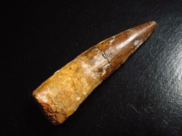 Dieser Zahn eines Spinosaurus ist geklebt worden. Er hat eine schon ungewöhnliche Länge und stammt aus Marokko. Das Alter beträgt ca. 90-110 Millionen Jahre - keine Replik! Die Bilder zeigen den Zahn von Vorder- und Rückseite.