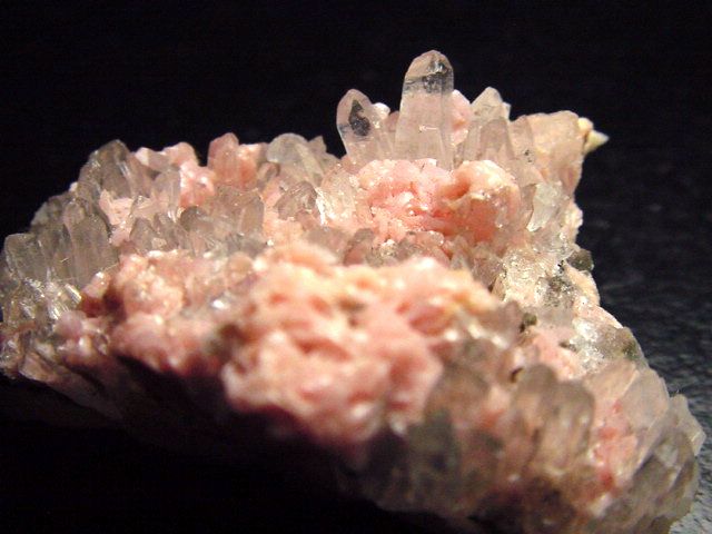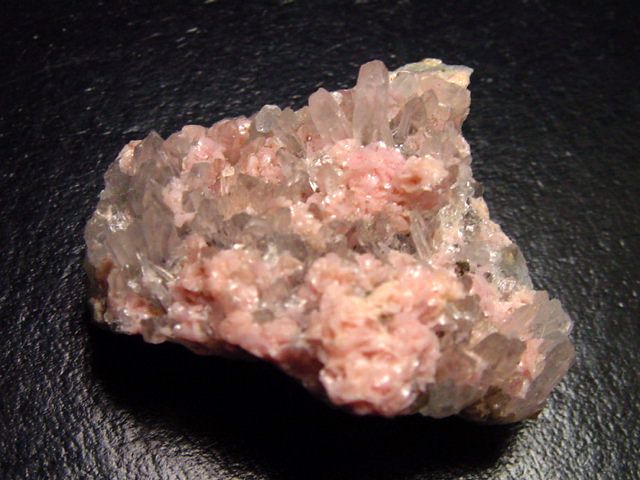 Reiche Rhodochrositstufe mit einer Vielzahl kleiner Rhodochrositkristalle vergesellschaftet mit Quarz. Schöne Sammlerstufe aus Argentinien.
