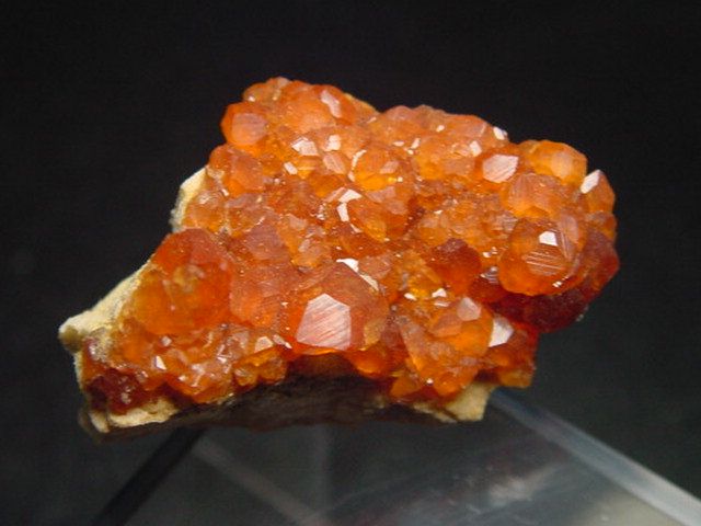 Reiche Spessartitstufe mit einer Vielzahl klarer, perfekt ausgebildeter Spessartitkristalle. Schöne Sammlerstufe aus Tongbei, China.