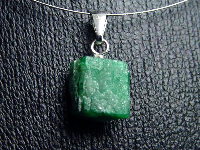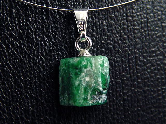 Säulenförmiger Smaragdkristall aus Kolumbien mit intensiver Farbe und Leuchtkraft, versehen mit einer Anhängeröse aus 925 Silber. Geeignet für Ketten bis 2,5 mm Durchmesser.