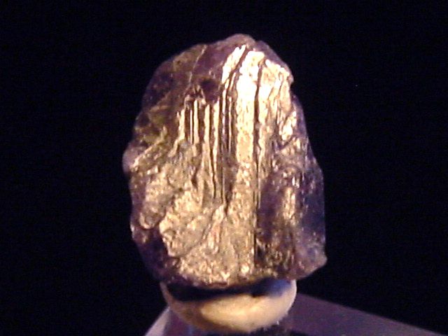 Alexandrite crystal with colorchange from the Alexandrite deposit of Carnaiba in Brazil. In daylight the Alexandrite crystal shows the typical color for Carnaiba Alexandrite, a dark green. Due to the colorchange abilities of Alexandrite it is not possible to get the natural colors on the photo. In weak artificial light, e.g. the light of a candle or a light bulb the color of the Alexandrite crystal changes into an intense violet color. The pictures show the crystal in artificial light.