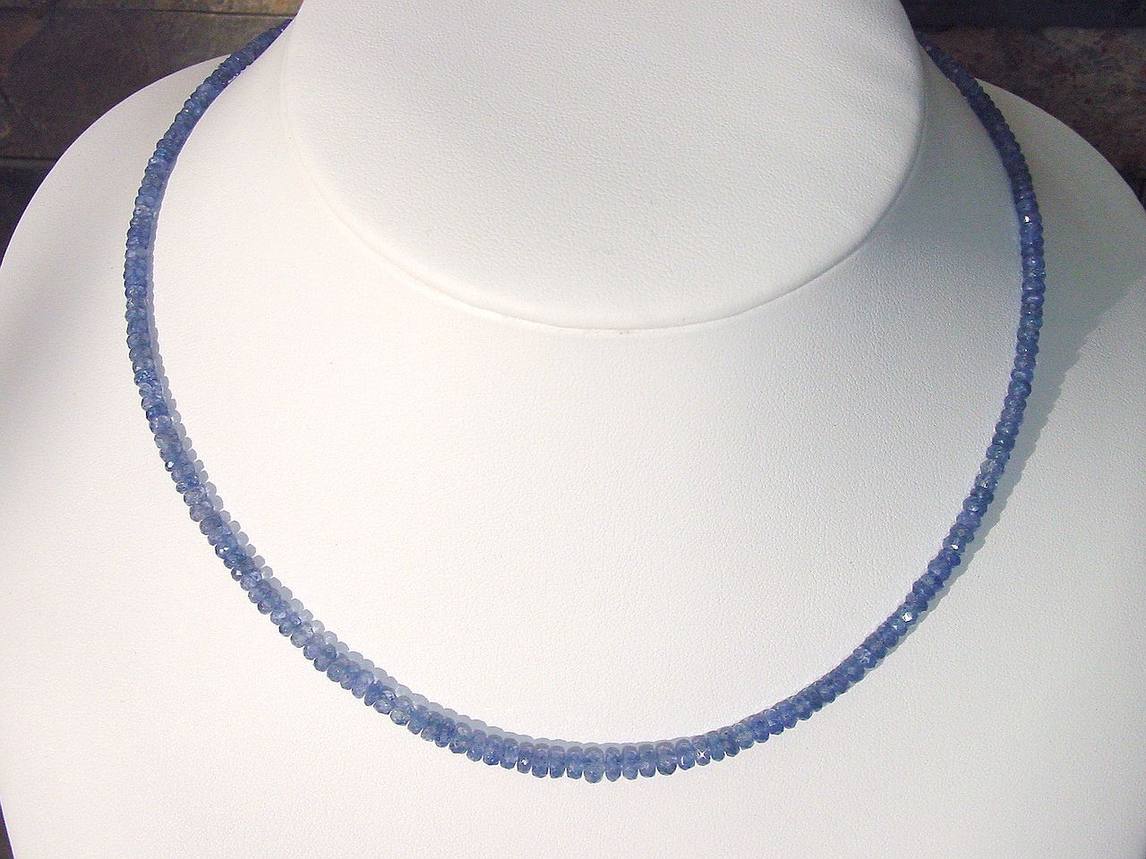 Kette aus 65,50 Carat facettierten Saphirlinsen in schöner transparenter Qualität, die Saphire zeigen intensive blaue Farbe und stammen aus Sri Lanka. Die Kette hat einen leichten Größenverlauf von 2,5 mm am Verschluß zu 4,5 mm im Kettenzentrum.